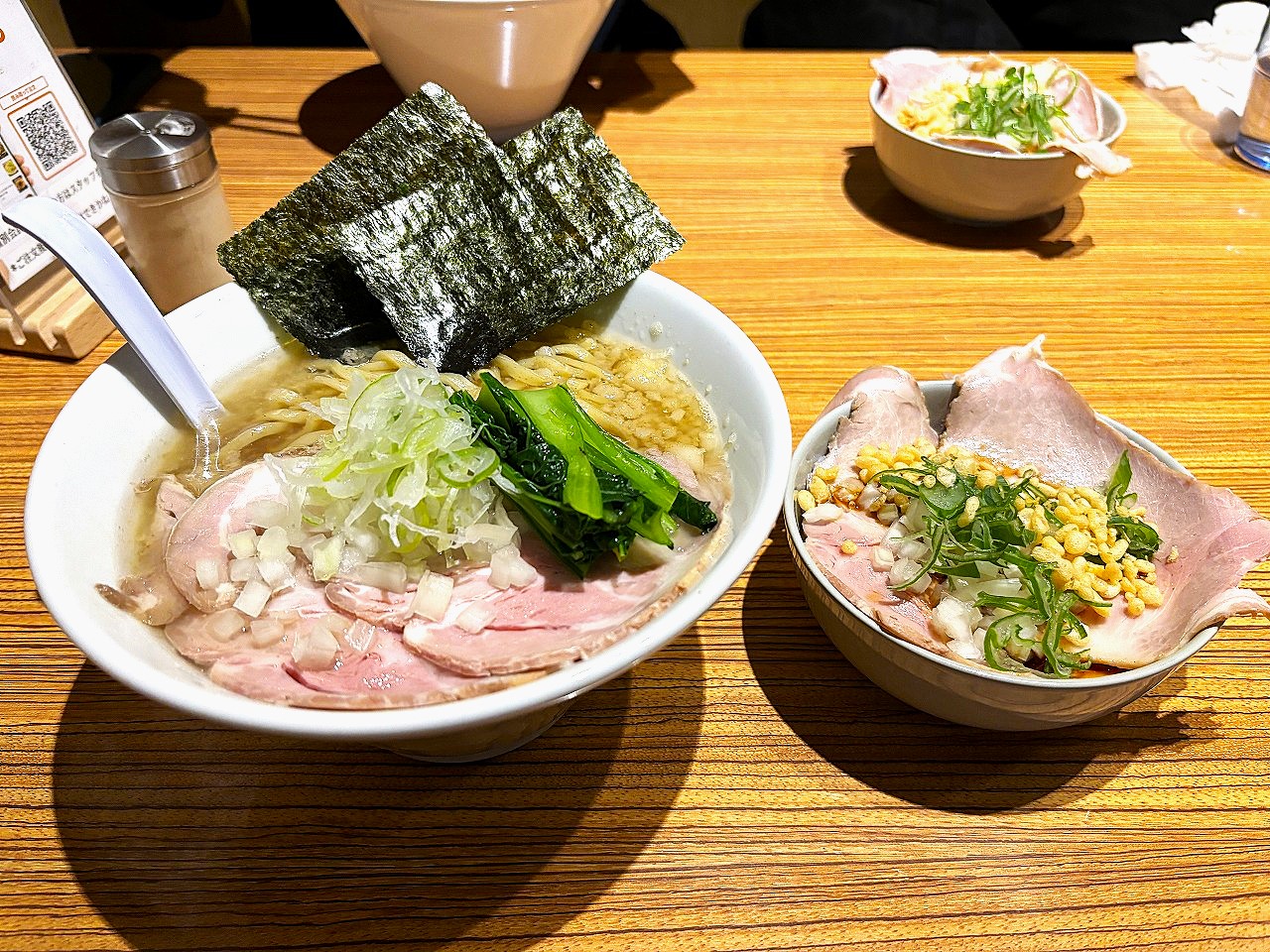 スープは煮干のえぐみが全くなく、うまみのみを濃縮。 麺は中太麺でトッピングに玉ねぎも入っていて、個人的に好みです。 チャーシューは薄切りでしっとりしています。バターも入っているのか?というくらい背脂が甘く、大変おいしかったです。ごちそうさまでした。